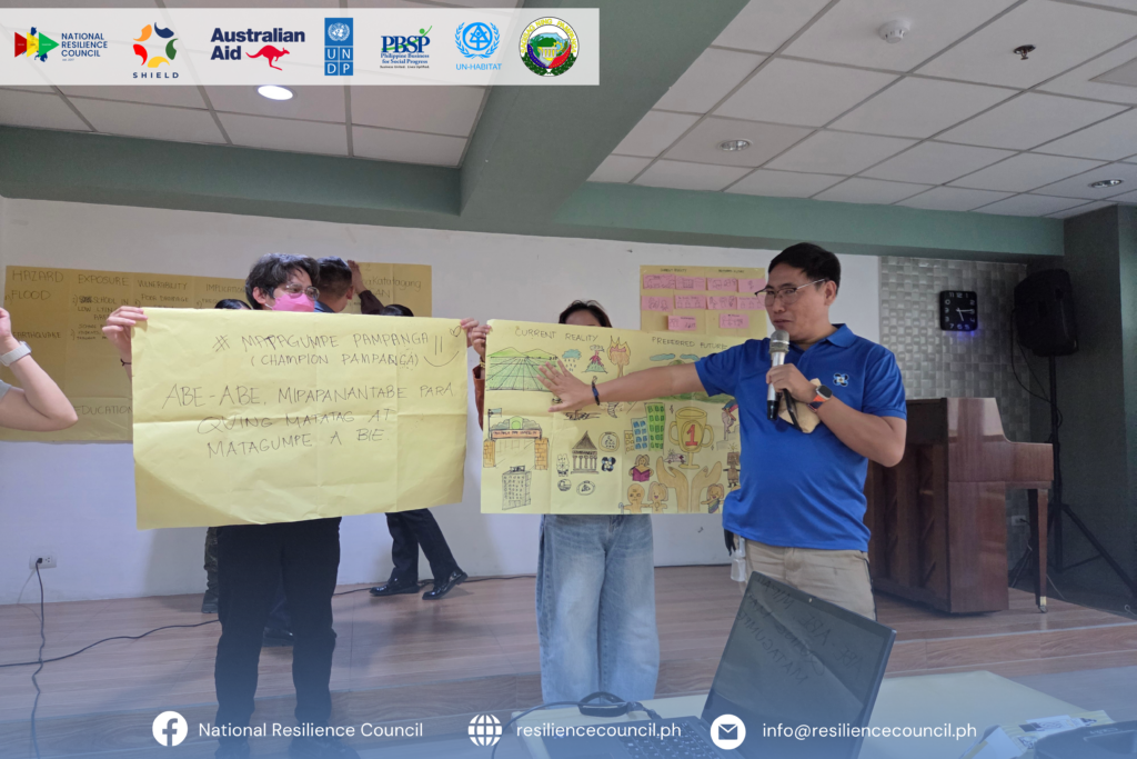 As a key outcome, participants co-created a shared resilience vision for Pampanga: “Matibay sa pagsubok, matatag sa laban,” reflecting unity in advancing adaptive, inclusive, and systems-driven resilience. While current realities point to disaster risks and vulnerable areas, the envisioned future highlights safer homes, organized communities, environmental stewardship, and collective progress—embodying strength, unity, and shared success for Kapampangans.