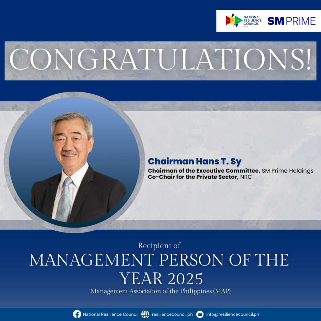 The National Resilience Council (NRC) extends its heartfelt congratulations to its Co-Chairperson for the Private Sector and Chairman of the Executive Committee of SM Prime Holdings for being honored with the prestigious Management Person of the Year Award by the Management Association of the Philippines (MAP).